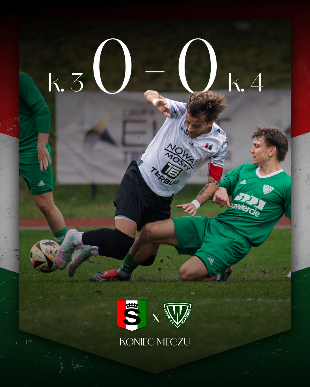 Spotkanie czołowych drużyn ligi okręgowej było niezwykle wyrównane i o jego losach musiał ostatecznie rozstrzygnąć konkurs rzutów karnych. Już od pierwszych minut zawodnicy z Zawiercia pokazali, że nie zamierzają przestraszyć się lidera ligi i mają ogromny apetyt na końcowy triumf. Kluczowym momentem meczu okazała się 22. minuta, kiedy z powodu kontuzji boisko musiał opuścić filar zespołu i jednocześnie trener – Tomasz Nowak. Jego miejsce zajął Oliwer Zalewski, dla którego ten mecz nie ułożył się pomyślnie. Od tego momentu przed drużyną stanęło trudne zadanie – gra bez swojego lidera.